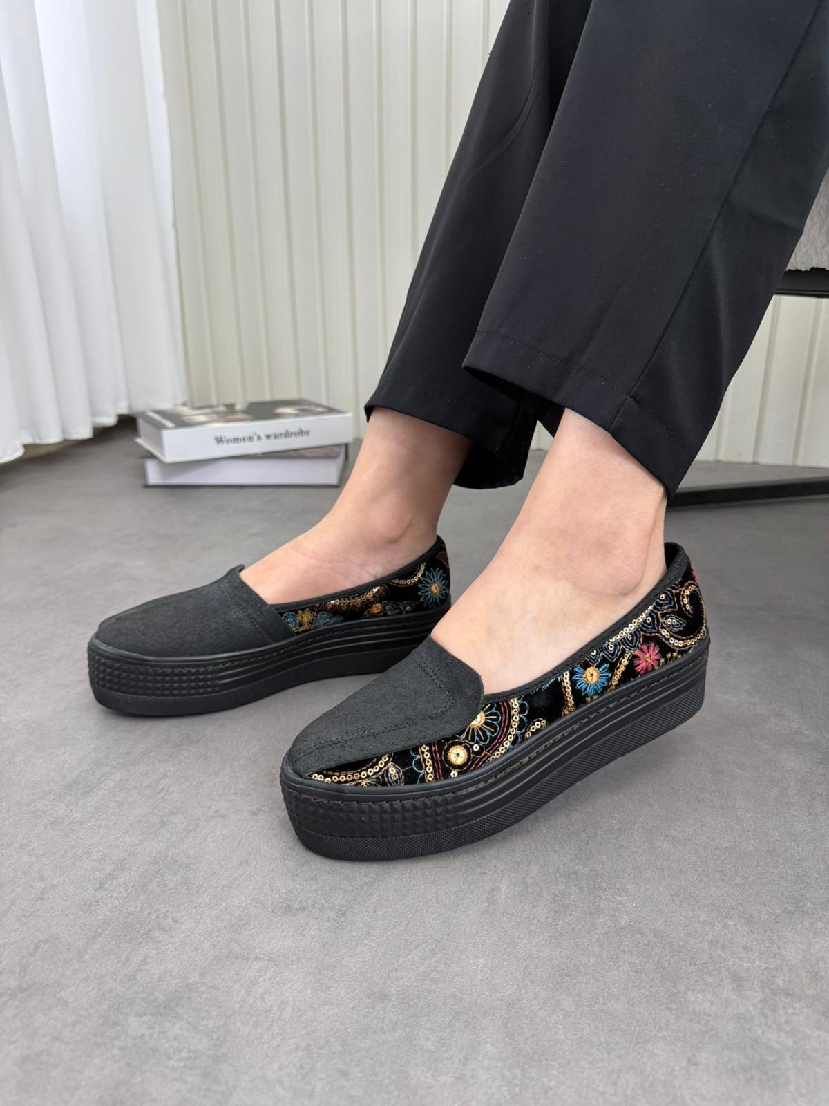 يتميز بجزء علوي من الجلد/السويد مع تفاصيل قماش مطرز بنقوش عصرية تضيف طابع فخم ومميز.