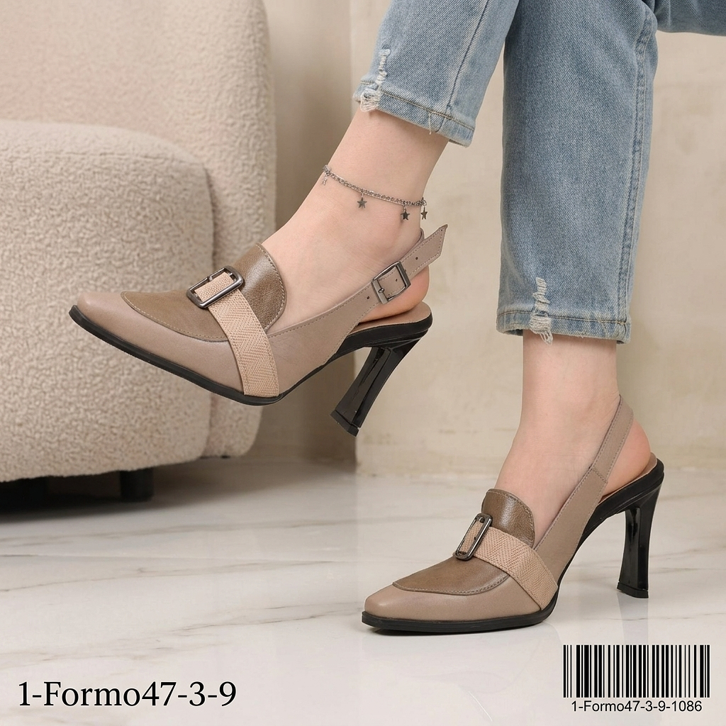 Handcrafted from premium natural leather, this slingback heel features a refined pointed silhouette, accented with a sleek strap and metallic buckle that elevate its sophisticated look. The balanced mid-height heel offers graceful lift with all-day comfort, making it ideal for both everyday wear and special occasions.